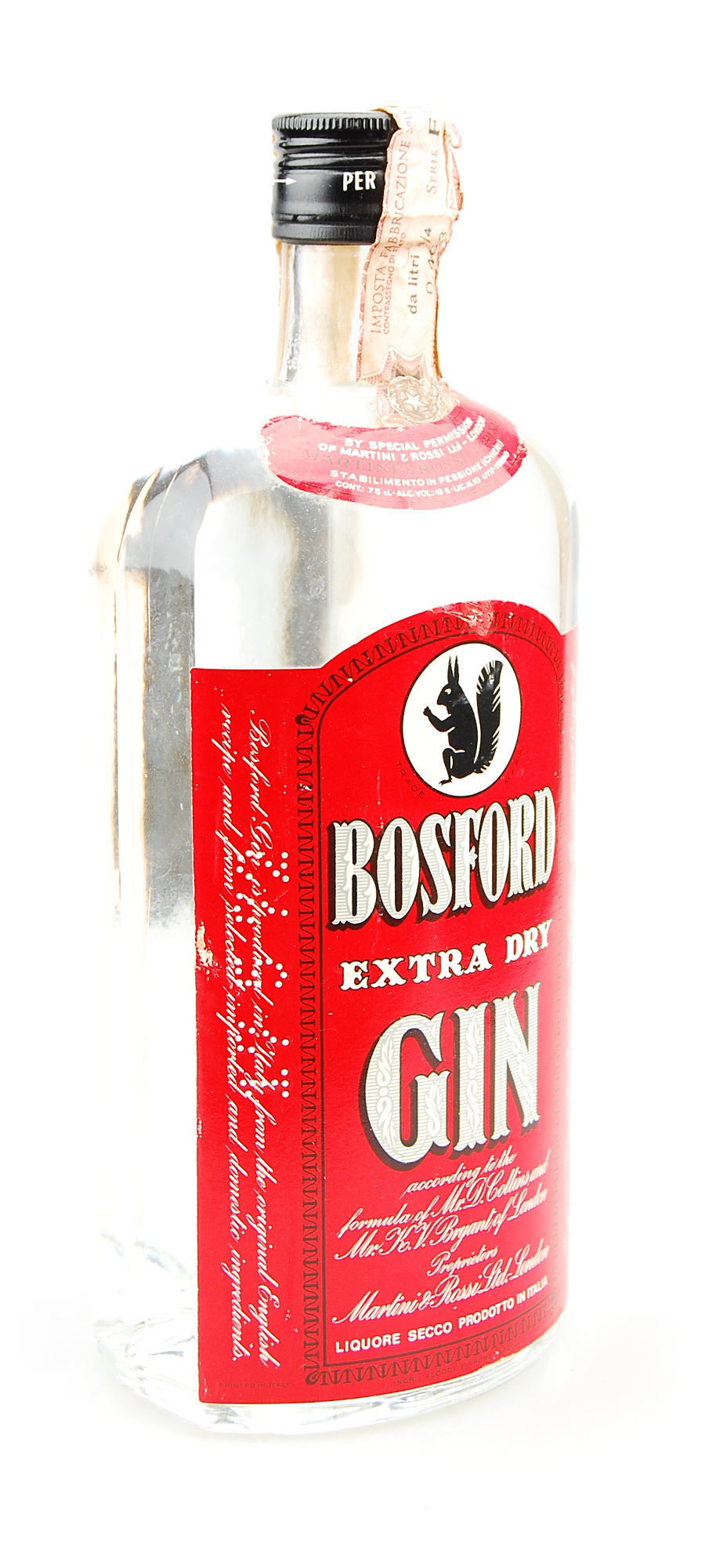 Der damals weltberühmte Bosford Extra Dry Gin wird nach einem typischen, alten und klassischen englischen Rezept produziert, mit einer weltweit anerkannten Qualitätsgarantie. Der Bosford Dry Gin ist nicht nur eine historische Marke, sondern vor allem eine in den 60er bis 80er Jahren weltberühmte und überall beliebte Bar-Marke, die in keiner gut sortierten Bar fehlen durfte und sich vorallem durch eine sehr gute Qualität und einen moderaten Preis auszeichgezeichnet hat. Dieser Dry Gin mit gestanzten Etikett mit der Jahrszahl 1972 wurde nach dem Rezept von Mr. Bryants aus London produziert und von der renommierten italienischen Hersteller-Firma Martini & Rossi in Flaschen abgefüllt.